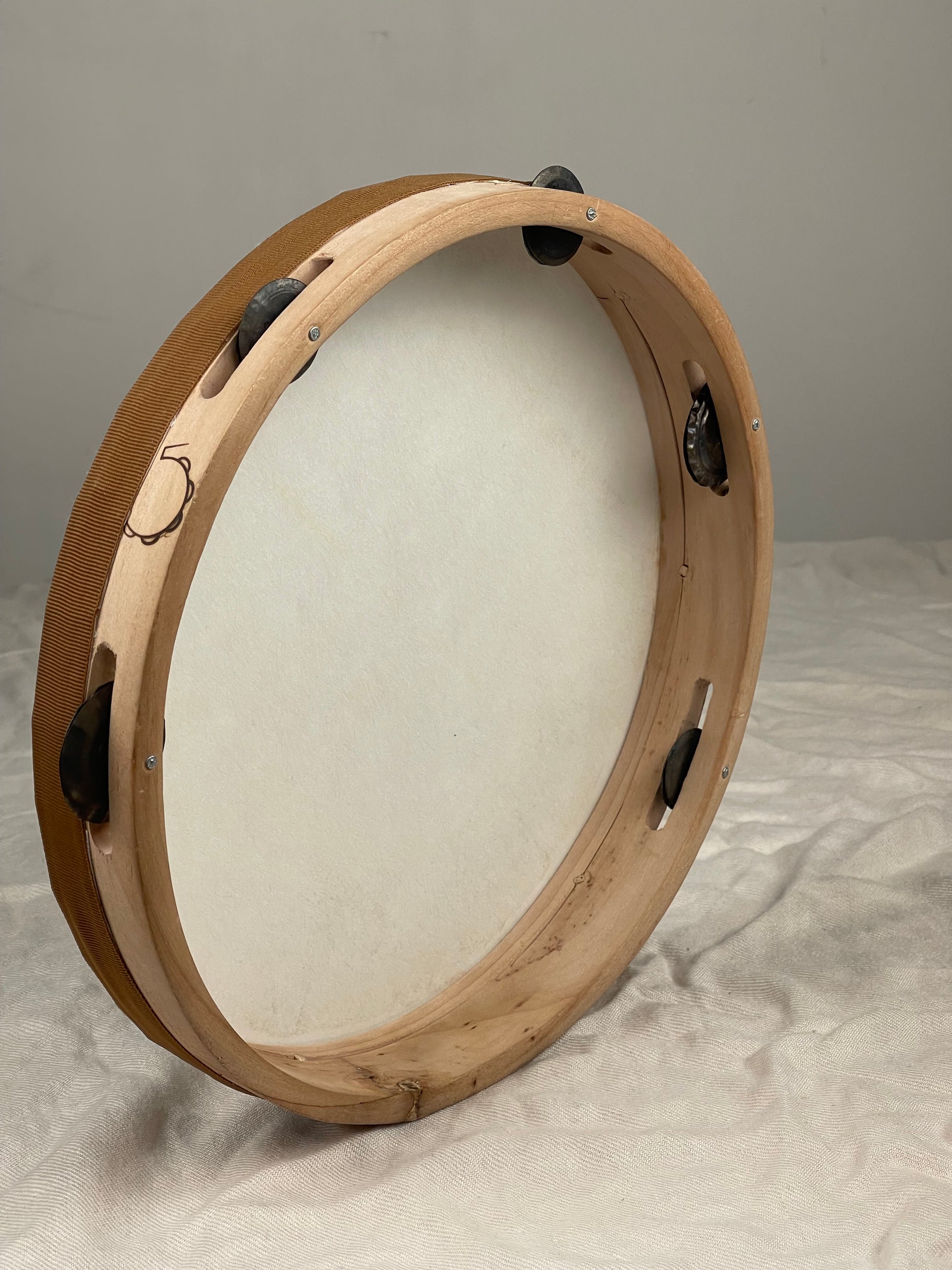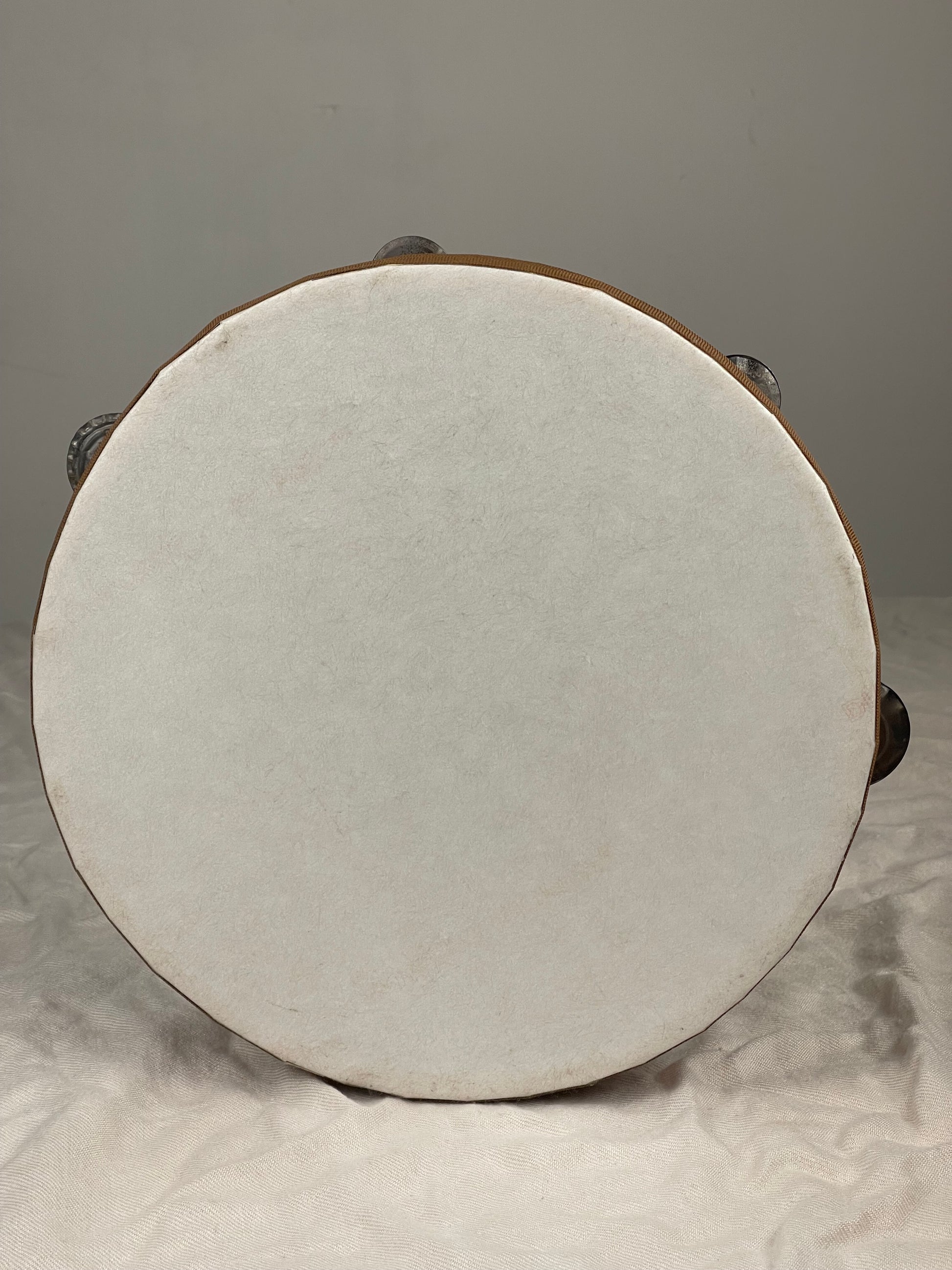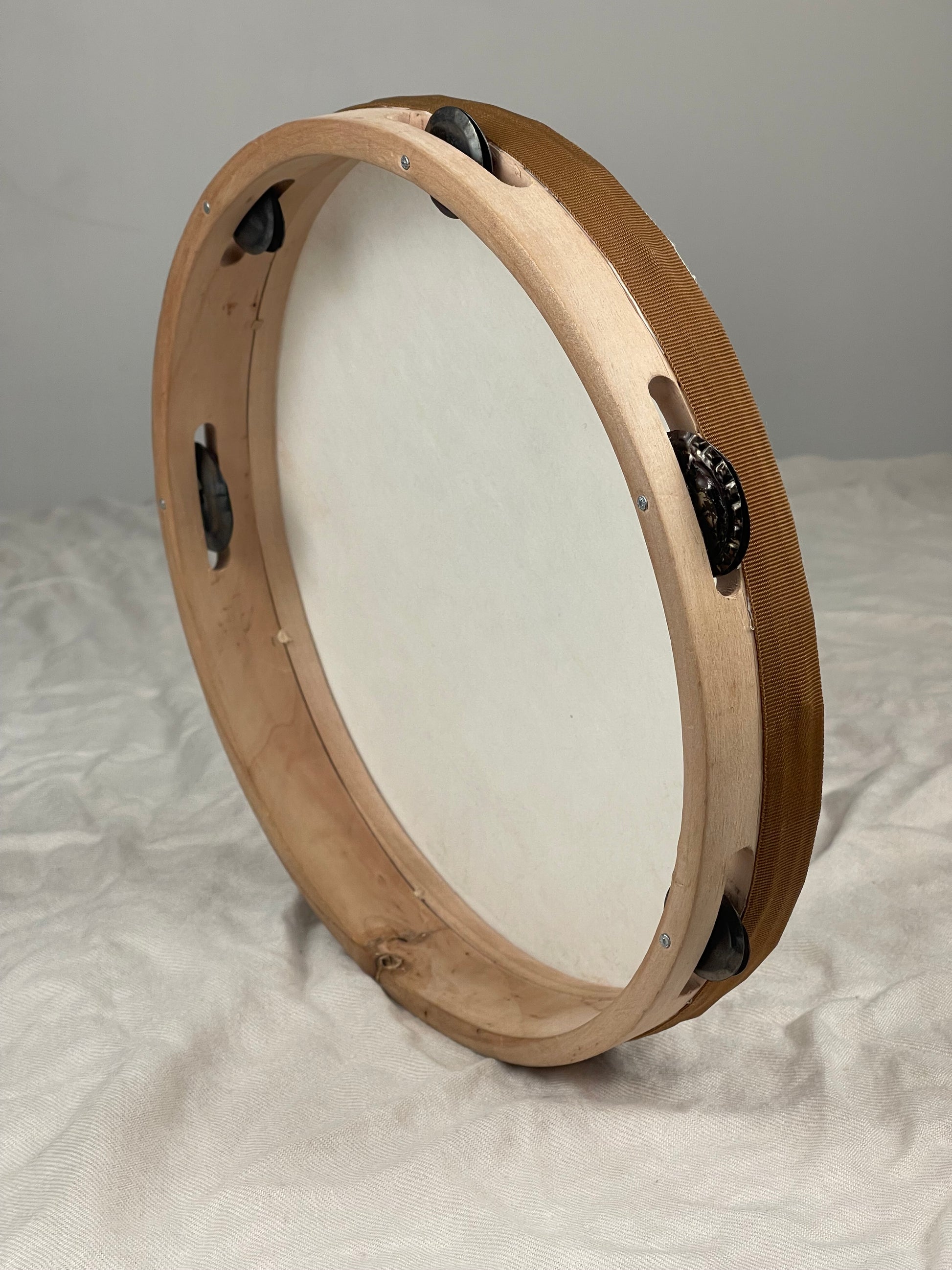 A compact and expressive tamburello, ideal for contemporary music. This 25 cm non-tunable model features a textured white synthetic head that delivers a warm and defined tone. The 5 pairs of carefully selected jingles create a rich modern sound. With a 4.5 cm deep frame and weighing just 160g, it offers excellent playability and responsiveness.