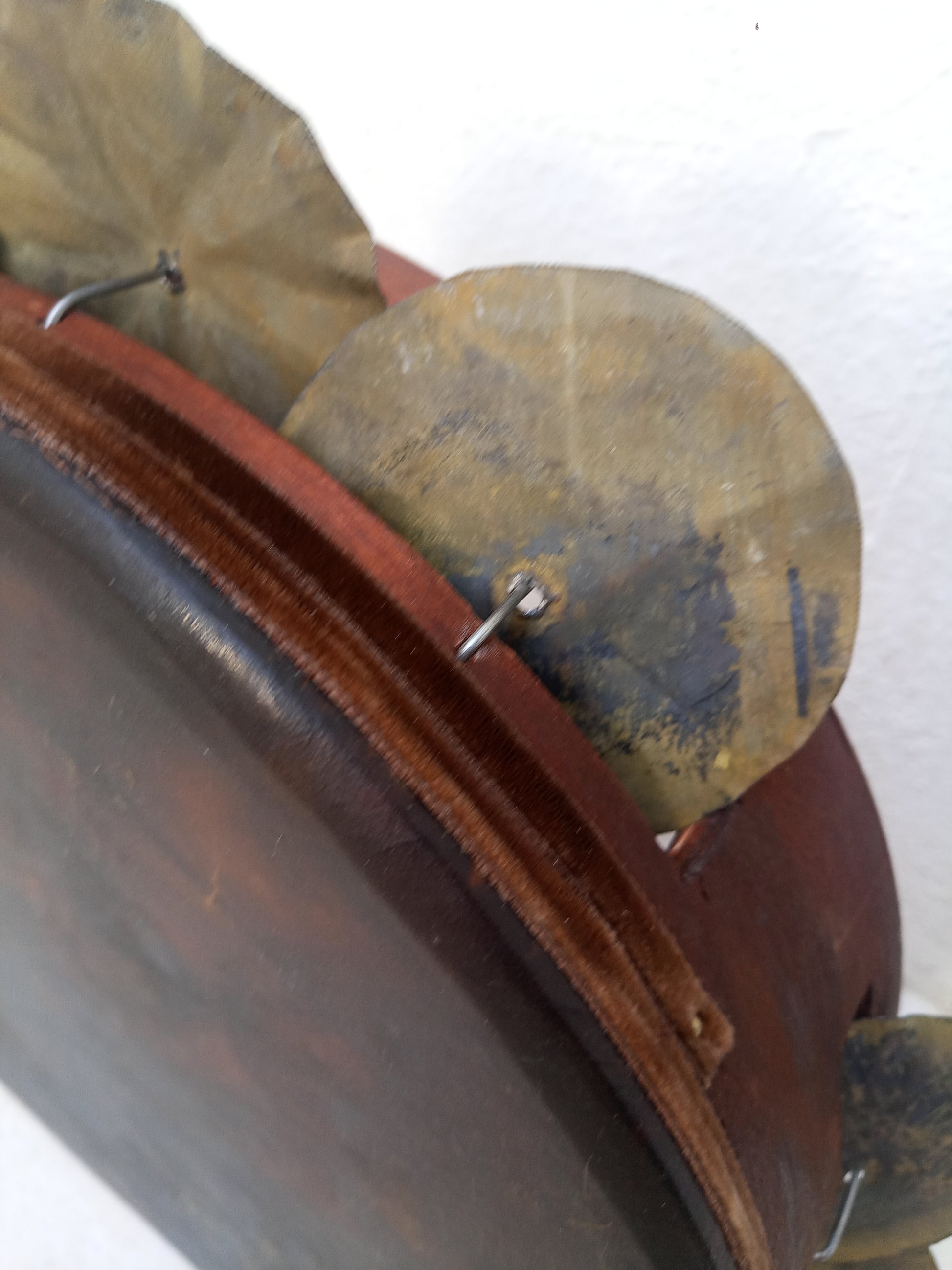 This 30 cm traditional Calabrian tambourine is built following the historic techniques of Southern Italy. The shell is made of mahogany wood—resonant and durable—while the goatskin head is hand-dyed black using natural pigments, preserving its full sonic response. The jingles are hand-hammered tin, producing a dry, cutting metallic tone true to Calabrian folk tradition.