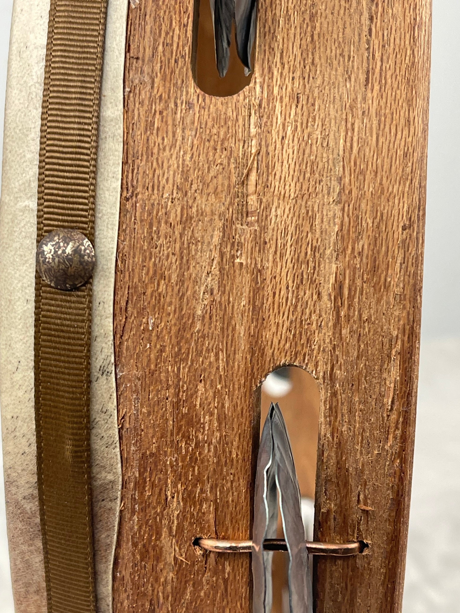 This 30 cm Calabrian tambourine is crafted following historic Southern Italian techniques. It features a mahogany shell for resonance and durability, a natural goatskin head, and 7 pairs of charred, hand-hammered tin jingles that produce a dry, cutting tone faithful to Calabrian folk tradition.